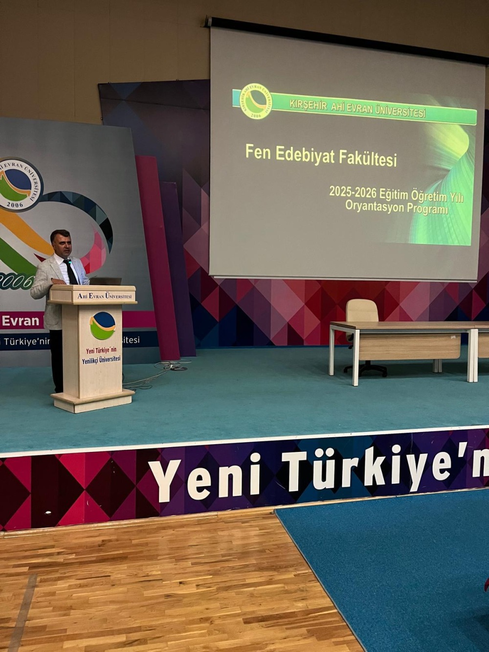 Kırşehir Ahi Evran Üniversitesi Fen Edebiyat Fakültesi, 2025-2026 Eğitim-Öğretim Yılı’na başlayan birinci sınıf öğrencileri için uyum eğitimi (oryantasyon) programını 25 Eylül 2025 tarihinde, saat 13.30’da Ahi Evran Konferans Salonu’nda düzenledi. Programa Fakülte Dekanı Prof. Dr. Faruk SELÇUK, Dekan Yardımcıları Doç. Dr. Mahmut MAK ve Dr. Öğr. Üyesi Mazlum AR’ın yanı sıra akademik ve idari personel ile çok sayıda öğrenci katıldı.